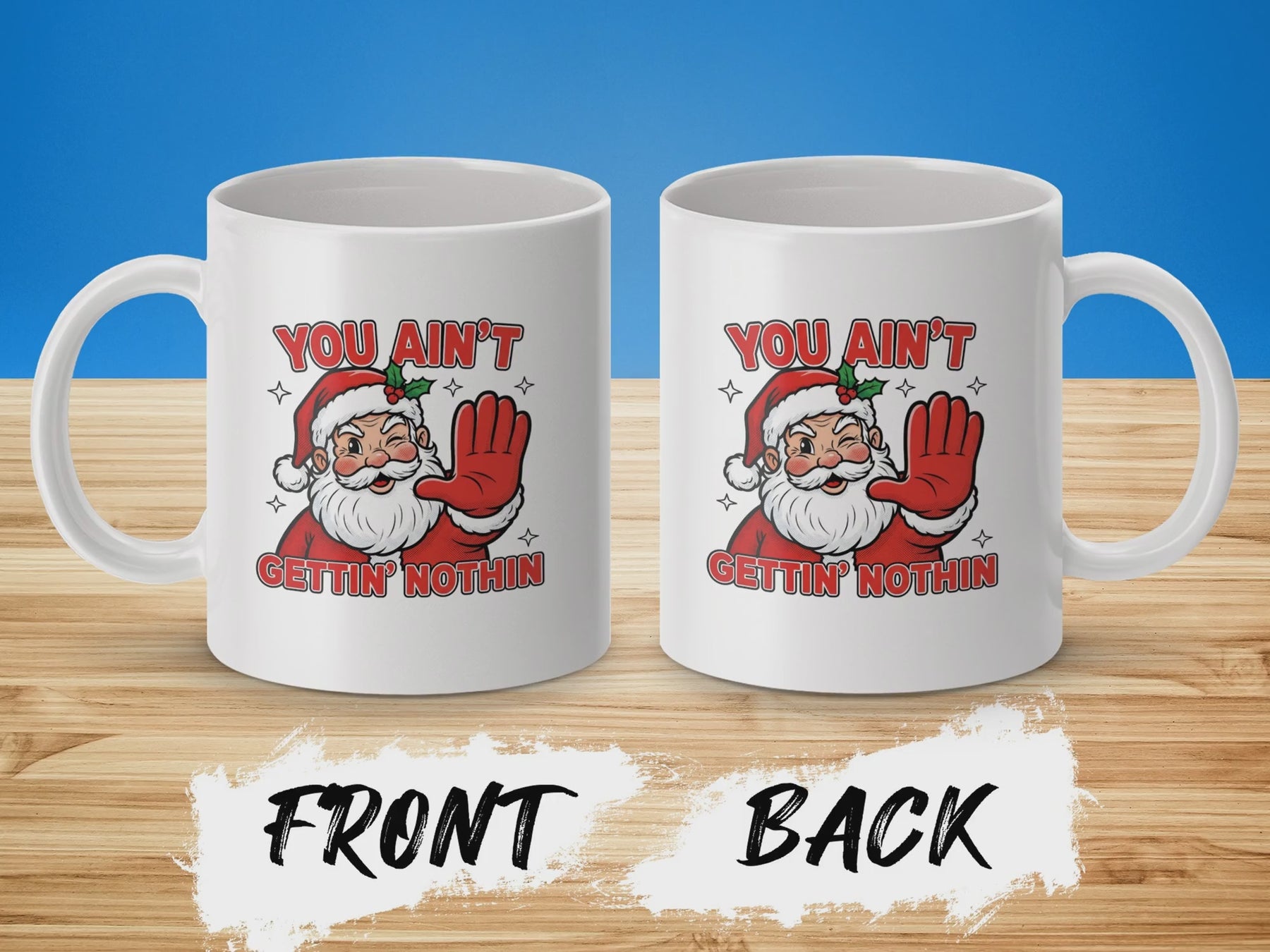 Bring a laugh to your holiday gatherings with this cheeky Santa mug! Featuring a witty Santa declaring "You Ain't Gettin Nothin," it's the perfect blend of humor and festive spirit. Whether you're sipping morning coffee or hot cocoa by the fire, this playful design captures the mischievous side of the season. A great gift for anyone who appreciates a good laugh during the holidays—or a fun treat for yourself!