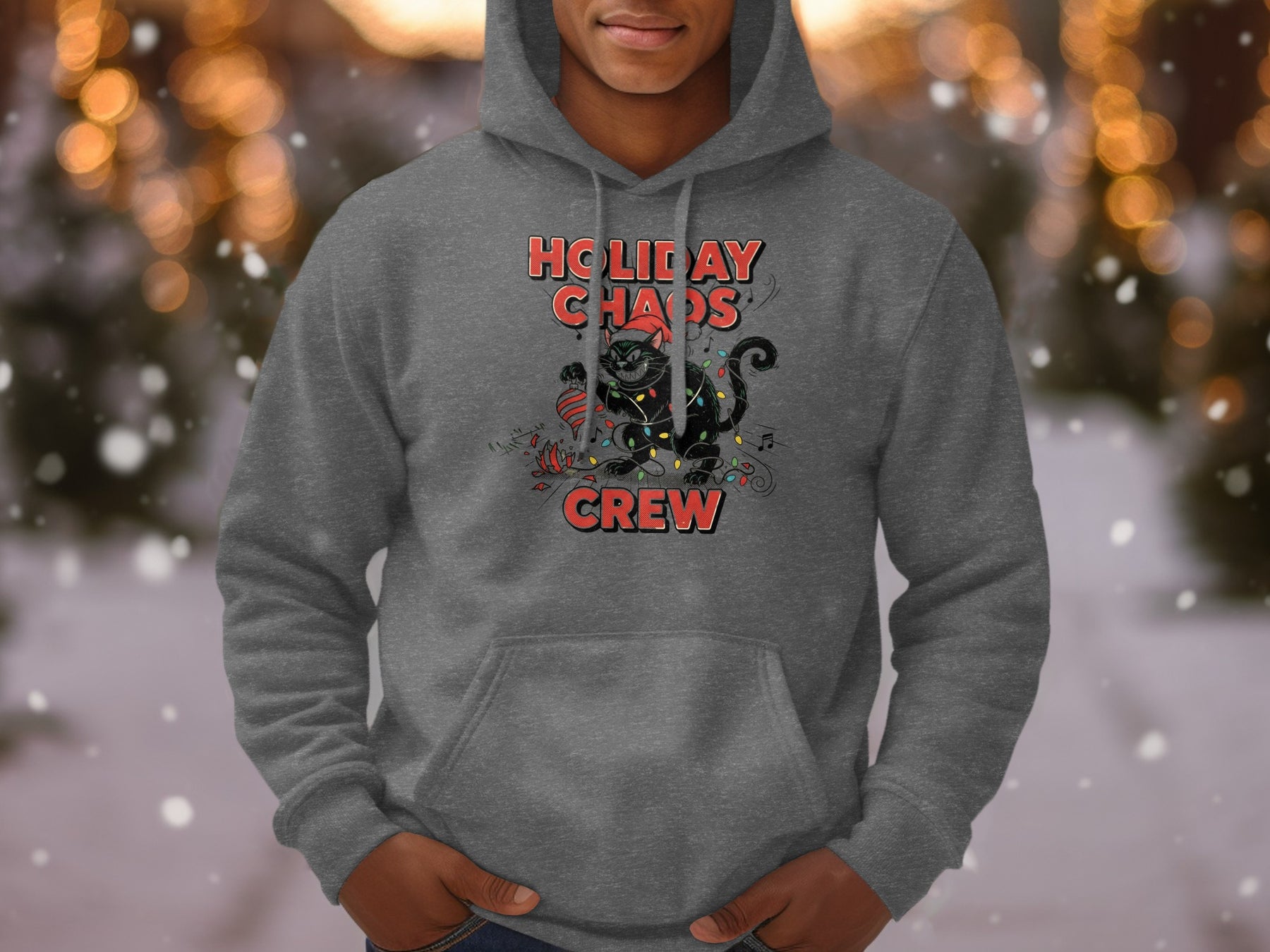 Get ready to laugh through the holidays with our Holiday Chaos Crew Hoodie. This playful design features a mischievous evil cat wrapped up in twinkling Christmas lights while gleefully destroying an ornament—because let's face it, cats are the real chaos agents of the season. Perfect for cat lovers and anyone who appreciates holiday humor with a twisted edge. Cozy comfort meets comedic chaos in one unforgettable hoodie.