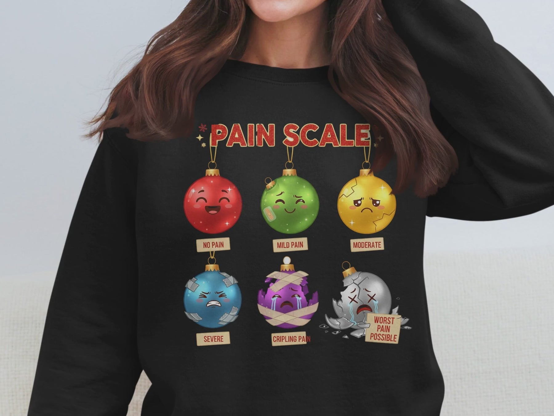 Show off your sense of humor with this playful Christmas-themed pain scale sweatshirt! Adorned with ornament spheres and cheeky faces that range from no pain to the worst pain imaginable, it’s the perfect cozy top for medical professionals who love a good laugh. Stay comfortable and festive while sharing a fun take on your daily grind.