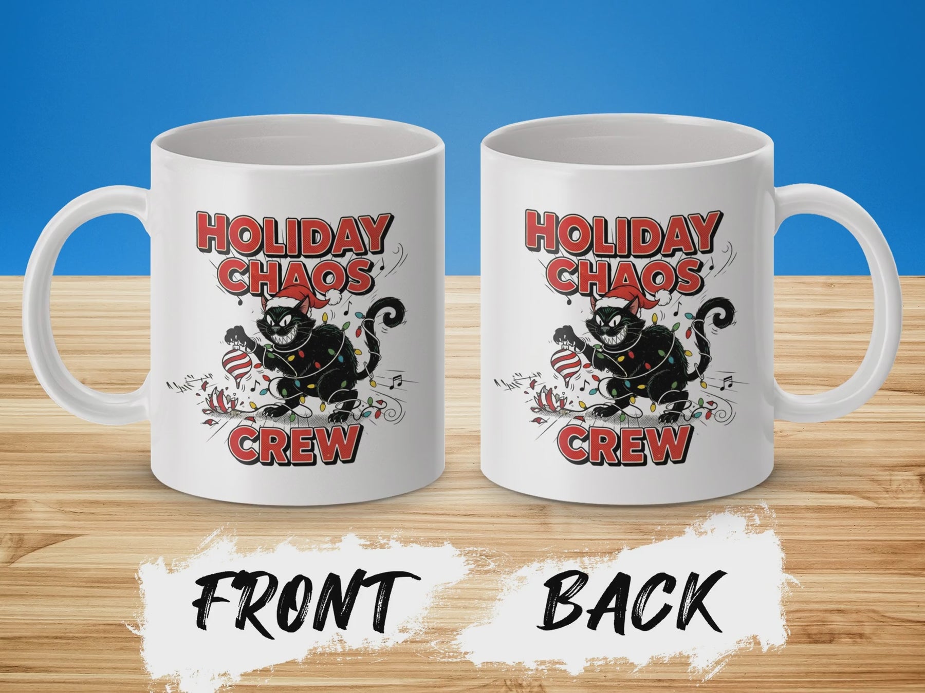 Start your day with a dash of holiday mischief! This playful mug showcases a cheeky black cat sporting a Santa hat, hilariously entangled in twinkling Christmas lights and ready to topple ornaments. Perfect for cat lovers and anyone who appreciates the chaotic charm of festive season shenanigans. Sip your morning coffee while celebrating the delightful mayhem only a mischievous feline can bring to holiday decorating. A fun gift for those who embrace the messy, joyful side of Christmas.